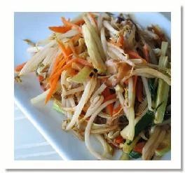 很平常的家常菜,卻五顏六色酸酸甜甜很讓人有食欲。用糖醋壓豆腥味(不想用水先焯豆芽,要不然豆芽就不脆了),用顏色帶動(dòng)食欲。沒(méi)有具體介紹原料的用量,因?yàn)檫@菜真的可以自由發(fā)揮。韭菜要少放,否則味道太重。一共六種絲,還是以豆芽為主吧。不饞肉的人,吃這一大盤菜就夠了.因?yàn)槭翘谴孜?味覺(jué)也得到足夠的滿足,不太會(huì)有吃了一大堆菜還是不飽的感覺(jué).  熱量很低, 對(duì)在減肥中的人來(lái)講會(huì)少點(diǎn)結(jié)食中的痛苦.