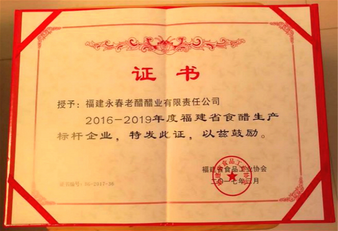 2016年10月8日,根據(jù)《福建省食品工業(yè)協(xié)會(huì)關(guān)于做好2016年福建省食品工業(yè)行業(yè)標(biāo)桿企業(yè)認(rèn)定工作的通知》工作要求,經(jīng)福建省食品工業(yè)協(xié)會(huì)組織專(zhuān)家對(duì)企業(yè)申報(bào)材料綜合評(píng)審和企業(yè)現(xiàn)場(chǎng)實(shí)地核查,擬定了3家企業(yè)為福建省食品工業(yè)各行業(yè)標(biāo)桿企業(yè),并將結(jié)果予以公示:其中認(rèn)定福建永春老醋醋業(yè)有限責(zé)任公司為“福建省食醋生產(chǎn)標(biāo)桿企業(yè)”。